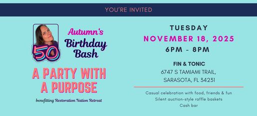 Join us as we celebrate Autumn’s 50th Birthday and help fund the mission of Restoration Nation Retreat. This fun, casual evening includes delicious food, meaningful connection, and a ticket-drop giveaway for themed baskets—all to support a nonprofit close to Autumn’s heart.